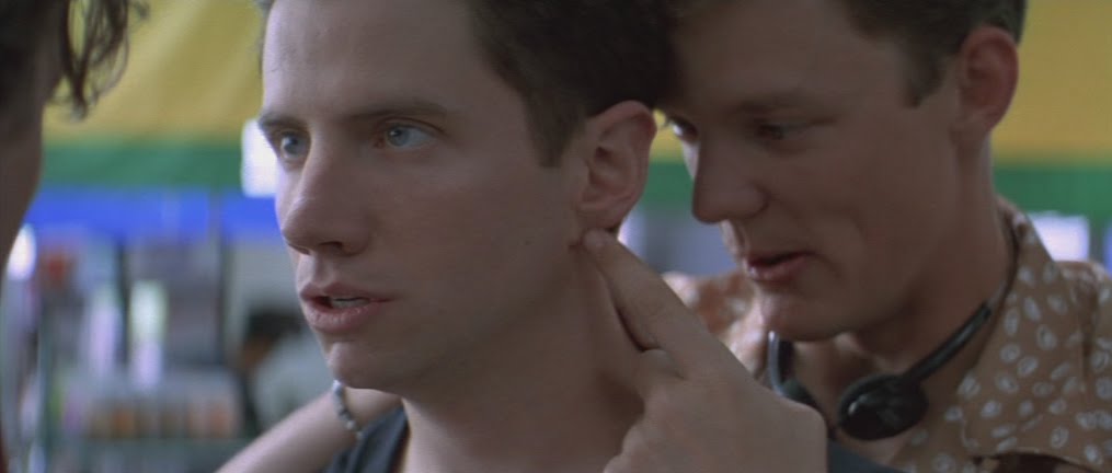 My "Movies in Movies" series used the Mother's Boys poster shot up there for this movie, but this scene also features clearly visible posters for other Miramax titles such as Smoke and Clerks. One poster I did not expect to see, and I only just picked it up now as I screencapped the movie, was a poster for Just Another Girl on the I.R.T. Now, I know Weinsteins obviously just filled this video store with posters for their own movies on the off chance that some obsessive weirdo such as myself was paying attention (there are more posters in the background but I cannot make them out), but Just Another Girl wasn't a particularly popular movie in 1992 when it came out, so I'm not sure why this video store in northern California would have a poster for it up in 1996.