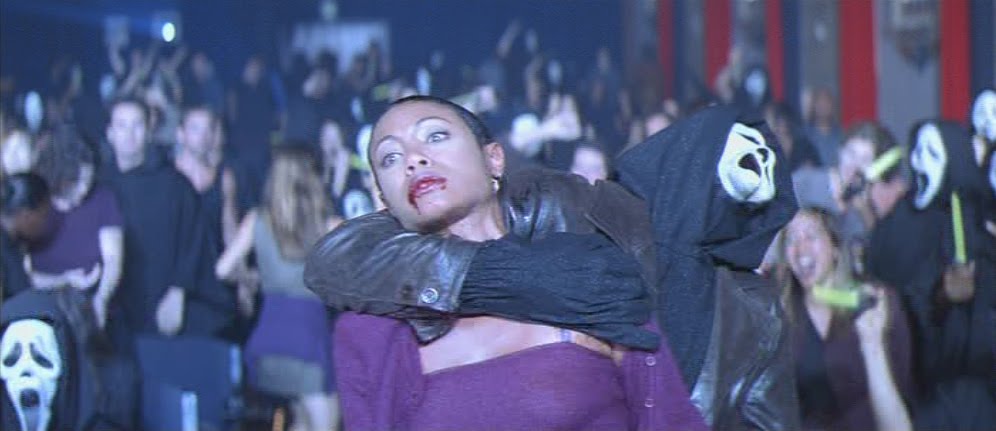 Jada's big scream. Love it! And against the backdrop of giant Ghostface on the cinema screen? Kind of a brilliant composition, don't you think? Might as well be saying "I'm baaaack!"